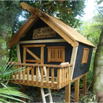 Great value trendy black and brown stained Playhouse includes internal rope ladder or fixed ladder to access loft, deck and a nice price tag!